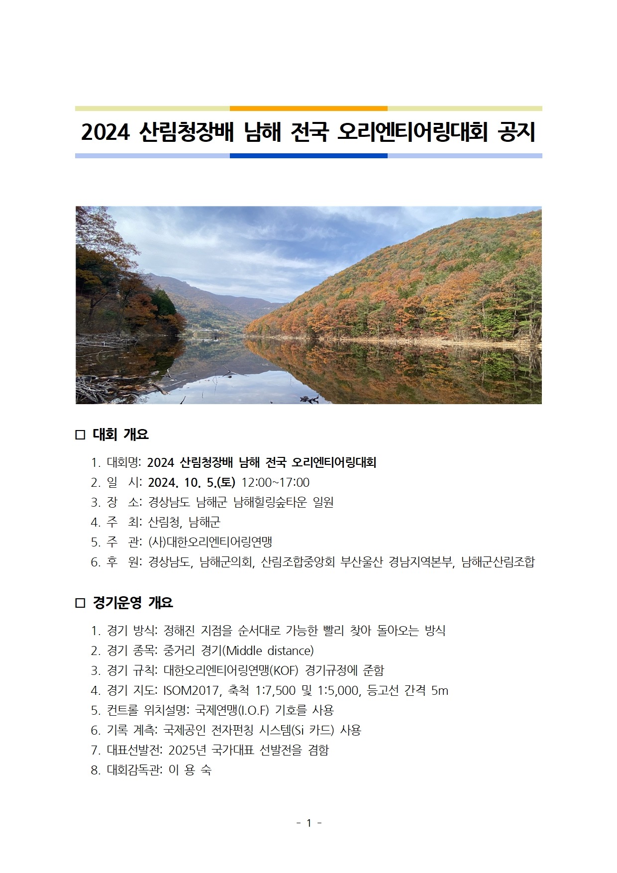 오리엔티어링을 통한 산림레포츠의 저변확대와 건전 여가활동을 제공하고자 [2024년 산림청장배 남해 전국 오리엔티어링대회]를 개최하게 되었습니다. 보물섬 남해에서 "독일마을 맥주축제" 기간중에 열리는 이번 대회에 많은 관심과 참가 바랍니다.