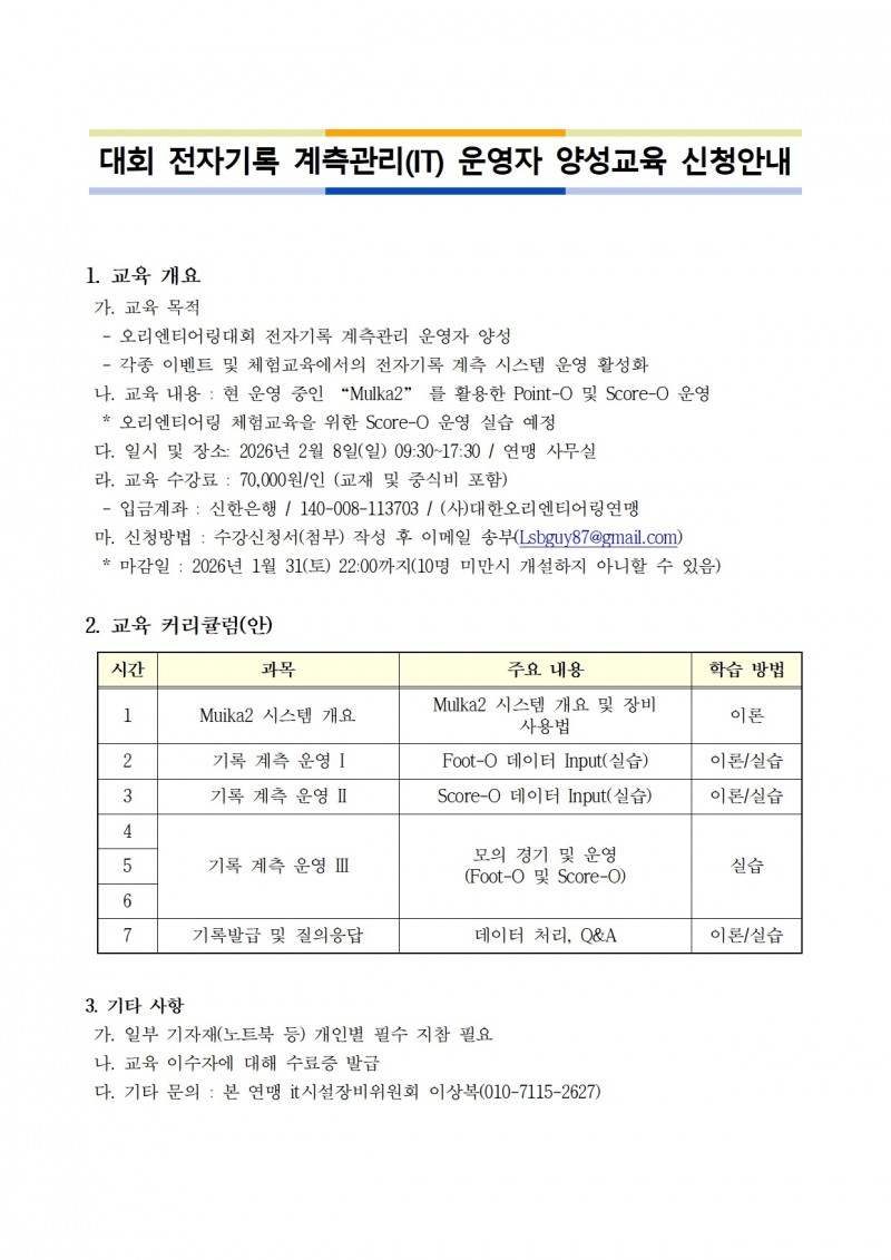2026년 대회 전자기록 계측관리(IT) 운영자 양성교육을 다음과 같이 개최하오니