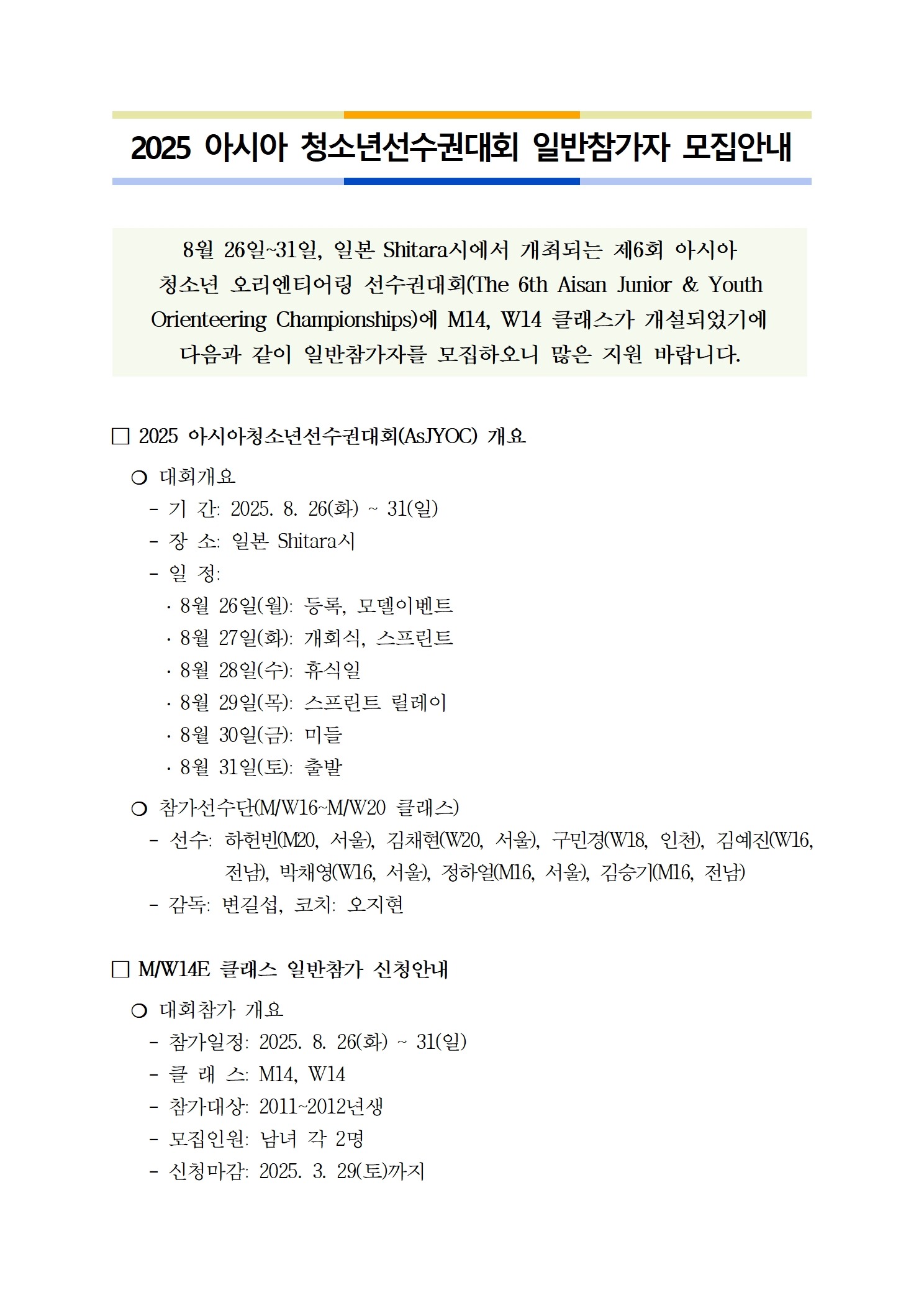 Orienteering Championships)에 M14, W14 클래스가 개설되었기에 다음과 같이 일반참가자를 모집하오니 많은 지원 바랍니다.