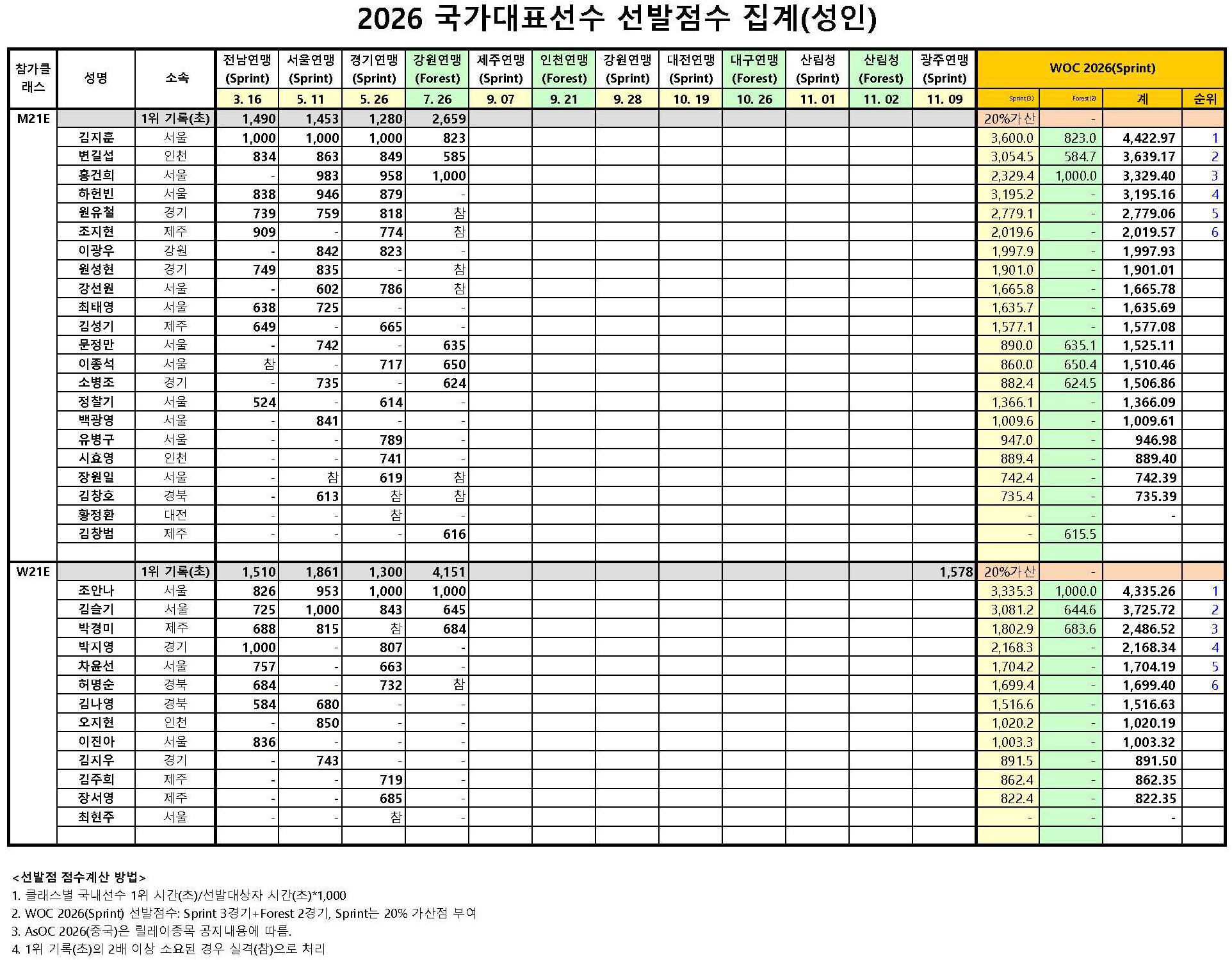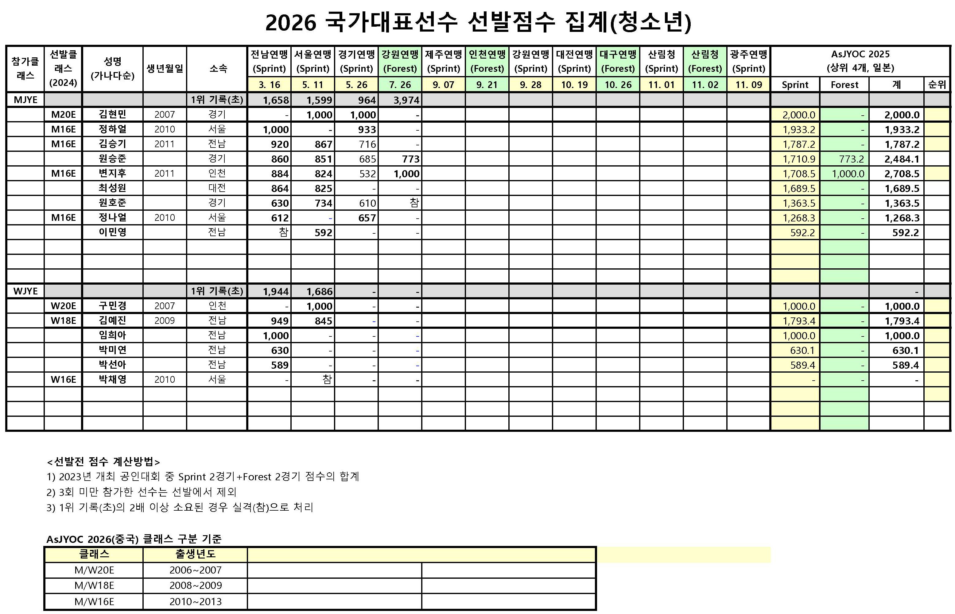 2025. 7월 26일 기준 "2026년도 국가대표 선발전" 점수집계 현황을 다음과 같이 공지합니다.