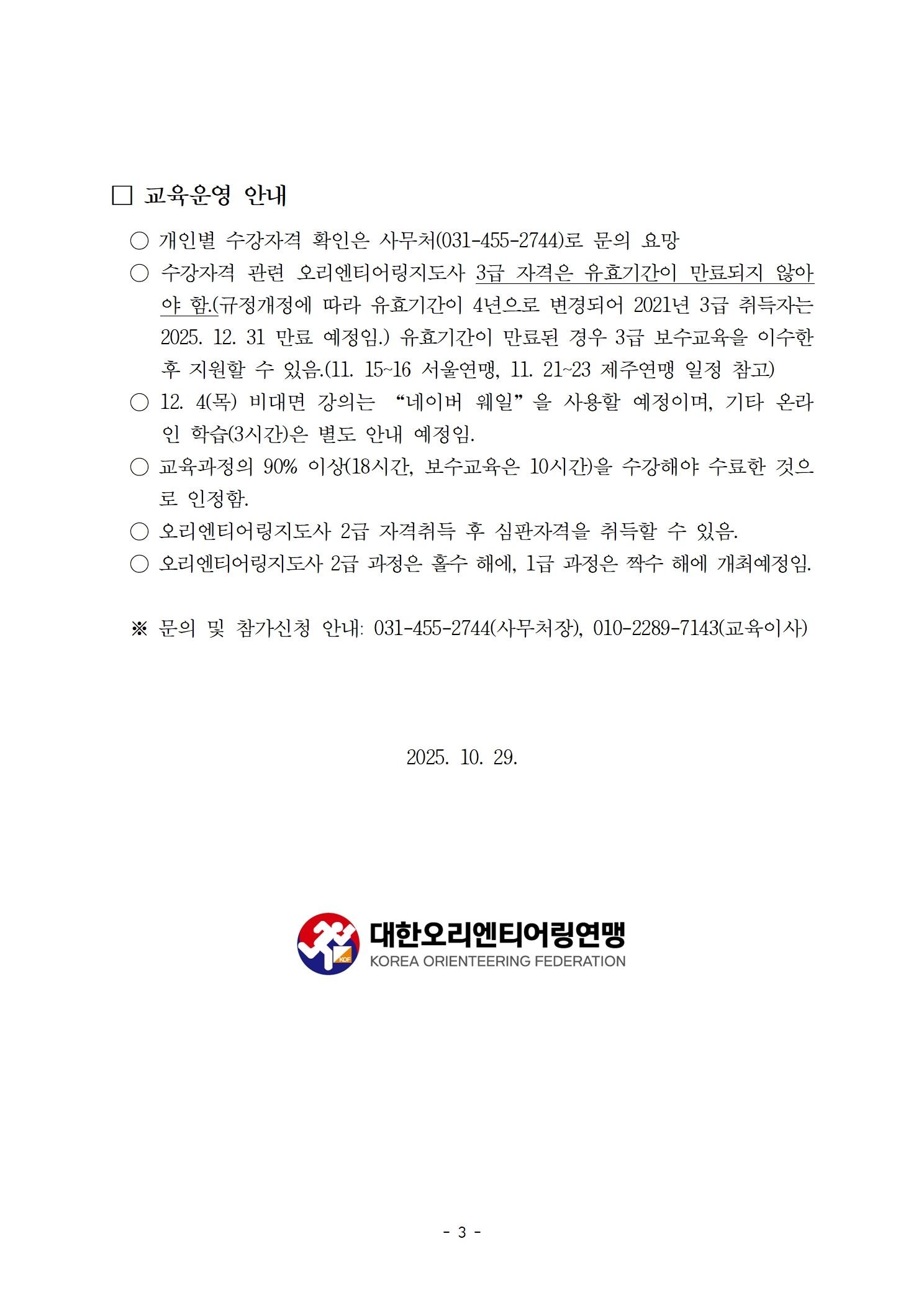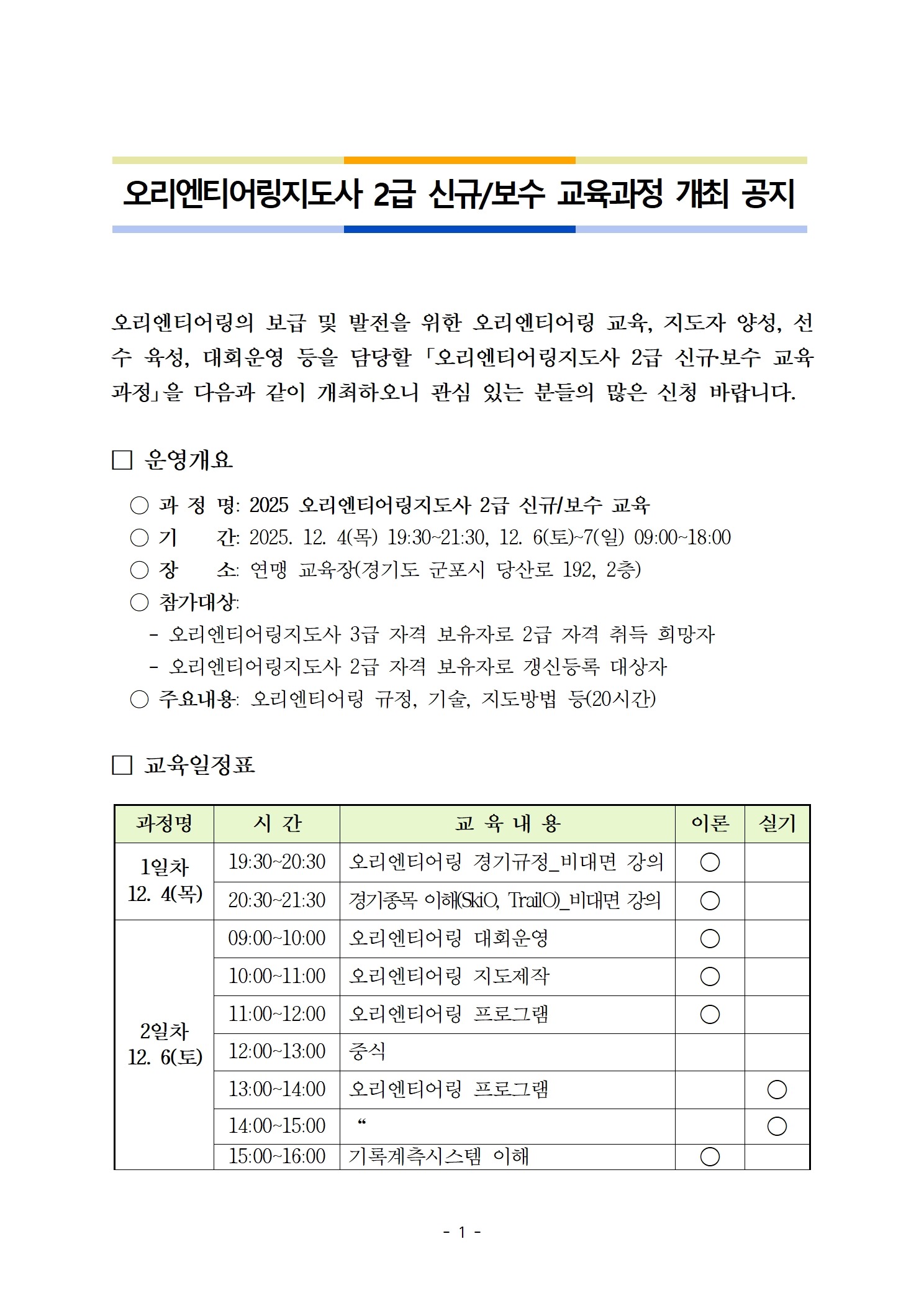 대회운영 등을 담당할 「오리엔티어링지도사 2급 신규‧보수 교육과정」을 다음과 같이 개최하오니