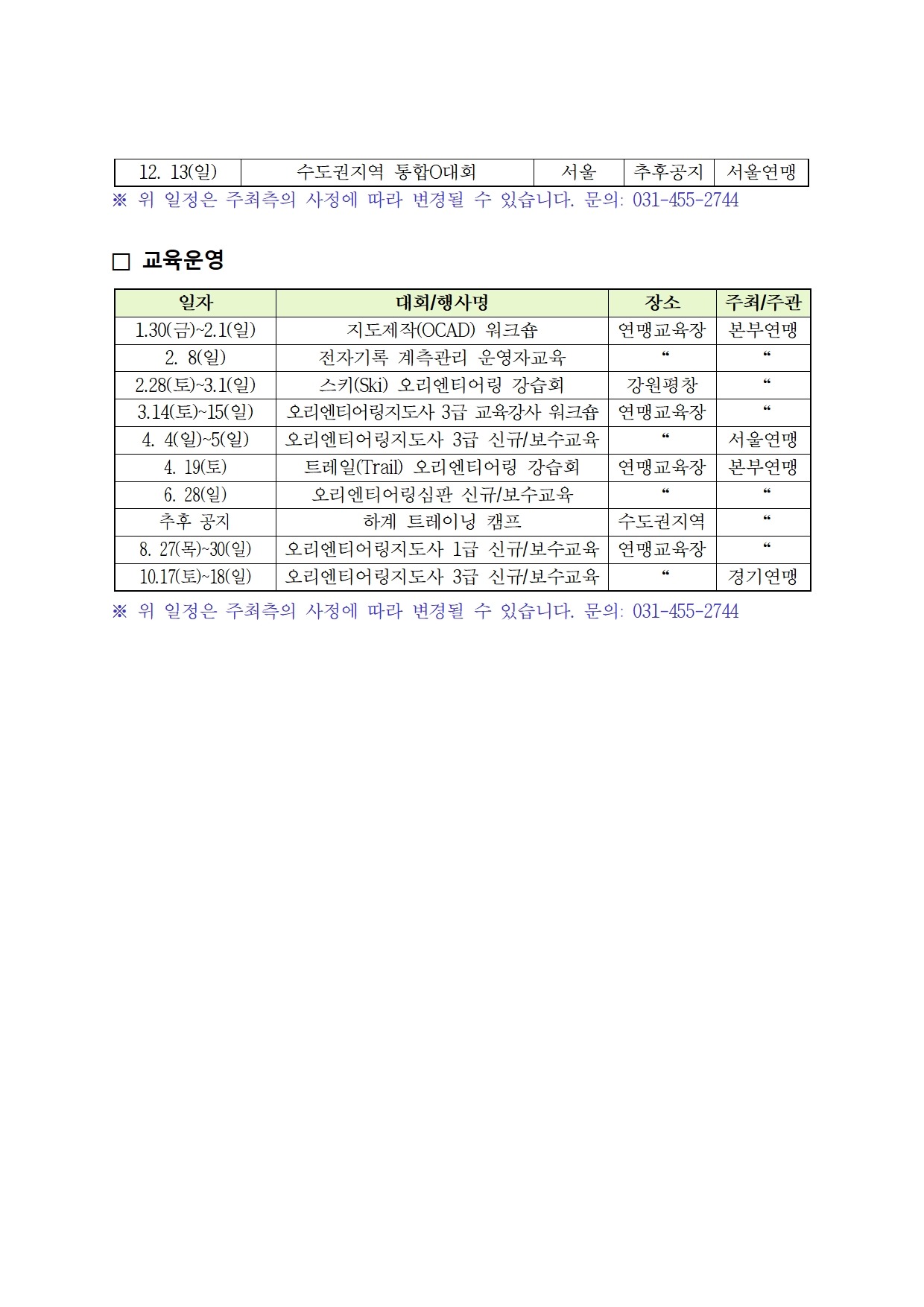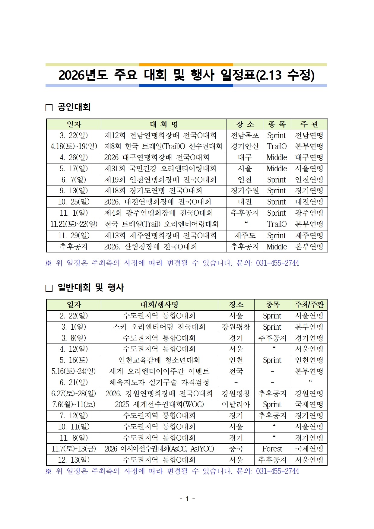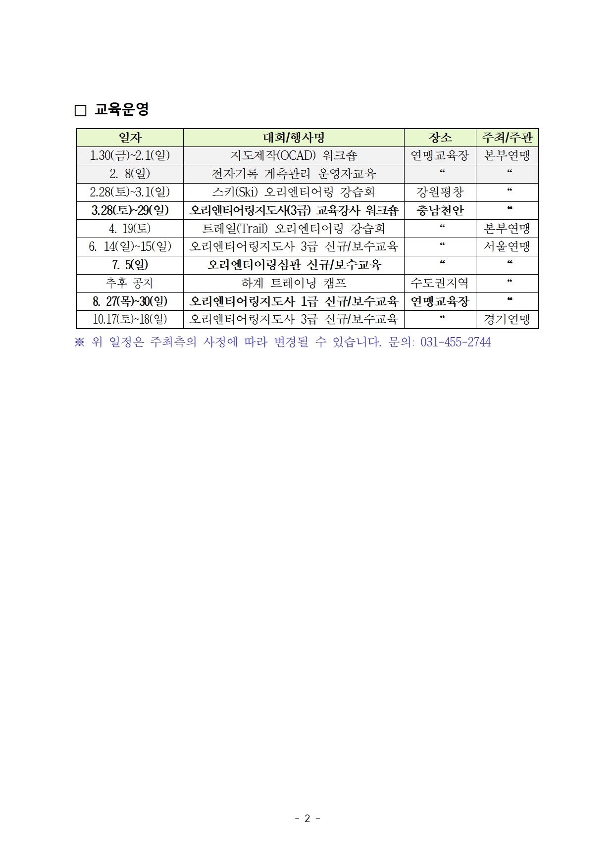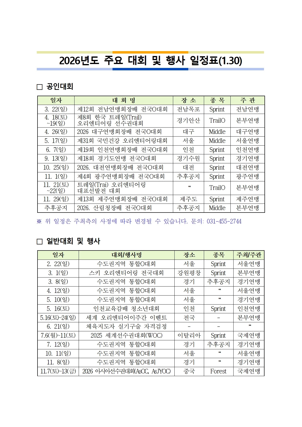 2026년 주요 대회 및 행사, 교육 등 일정을 다음과 같이 안내해드리오니 많은 관심과 참여 바랍니다.