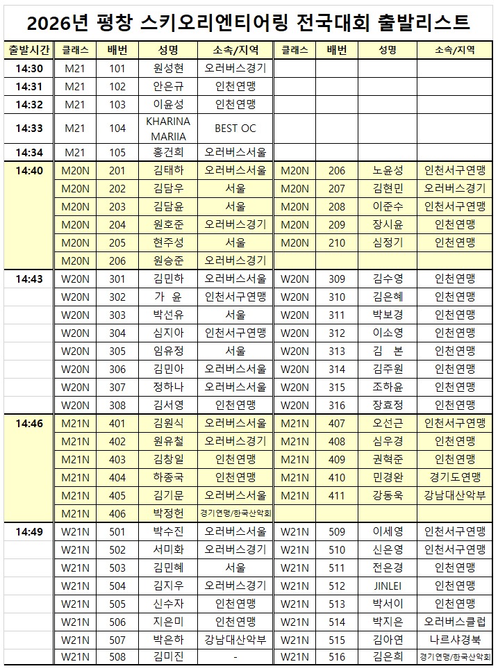 2026년 평창 스키오리엔티어링 전국대회 출발리스트입니다.
