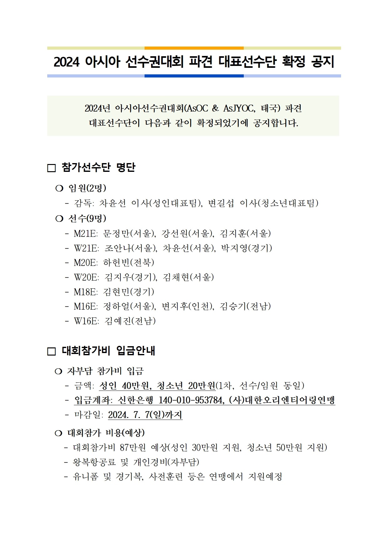 2024 아시아선수권대회(AsOC & AsJYOC) 파견 대표선수단이 다음과 같이 확정되었기에 이를 공지합니다.