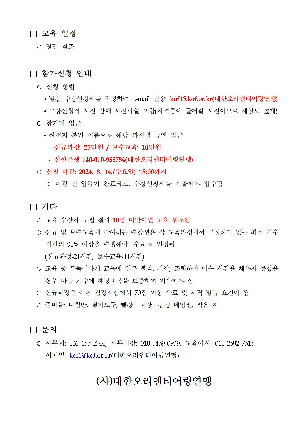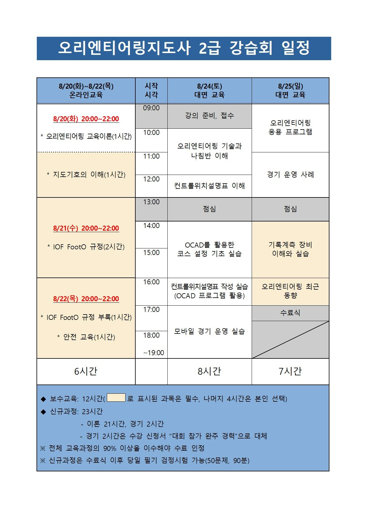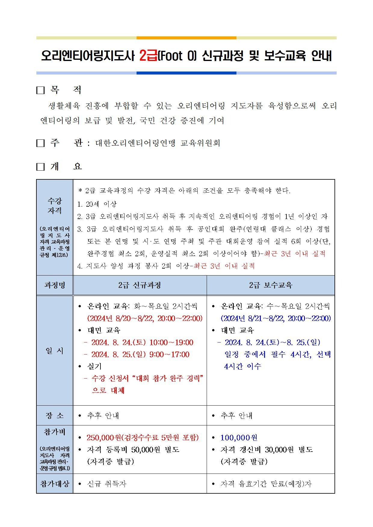 2024년 오리엔티어링지도사 2급 신규과정 및 보수교육을 개최하고자 했으나 신청인원 부족으로 인해 취소하게 되었음을 알려드립니다.