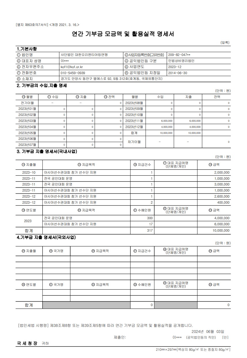 사단법인 대한오리엔티어링연맹은 지정기부금단체로, [법인세법 시행령]에 따라 2023년 연간 기부금 모금액 및 활용실적을 다음과 같이 공개합니다.