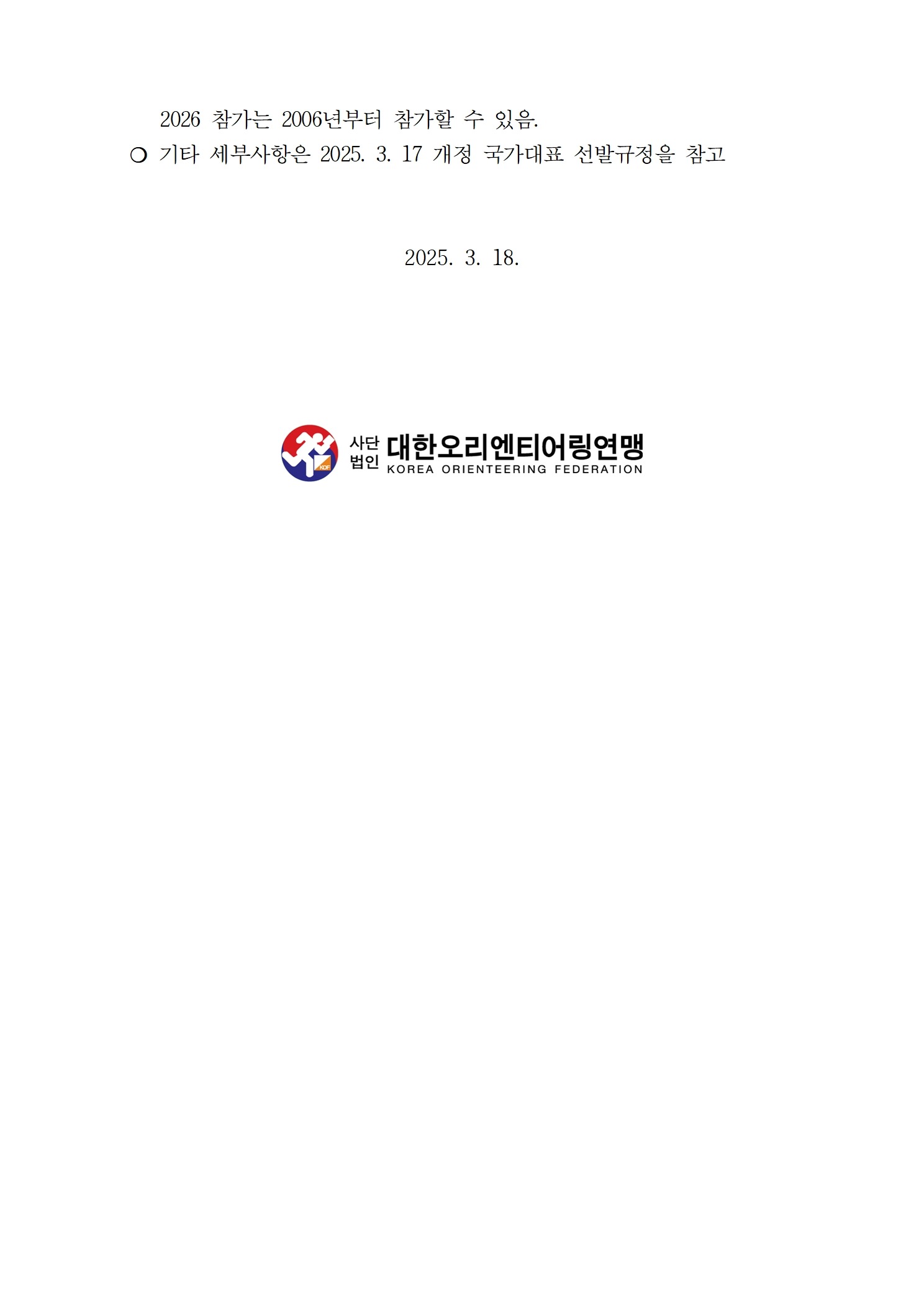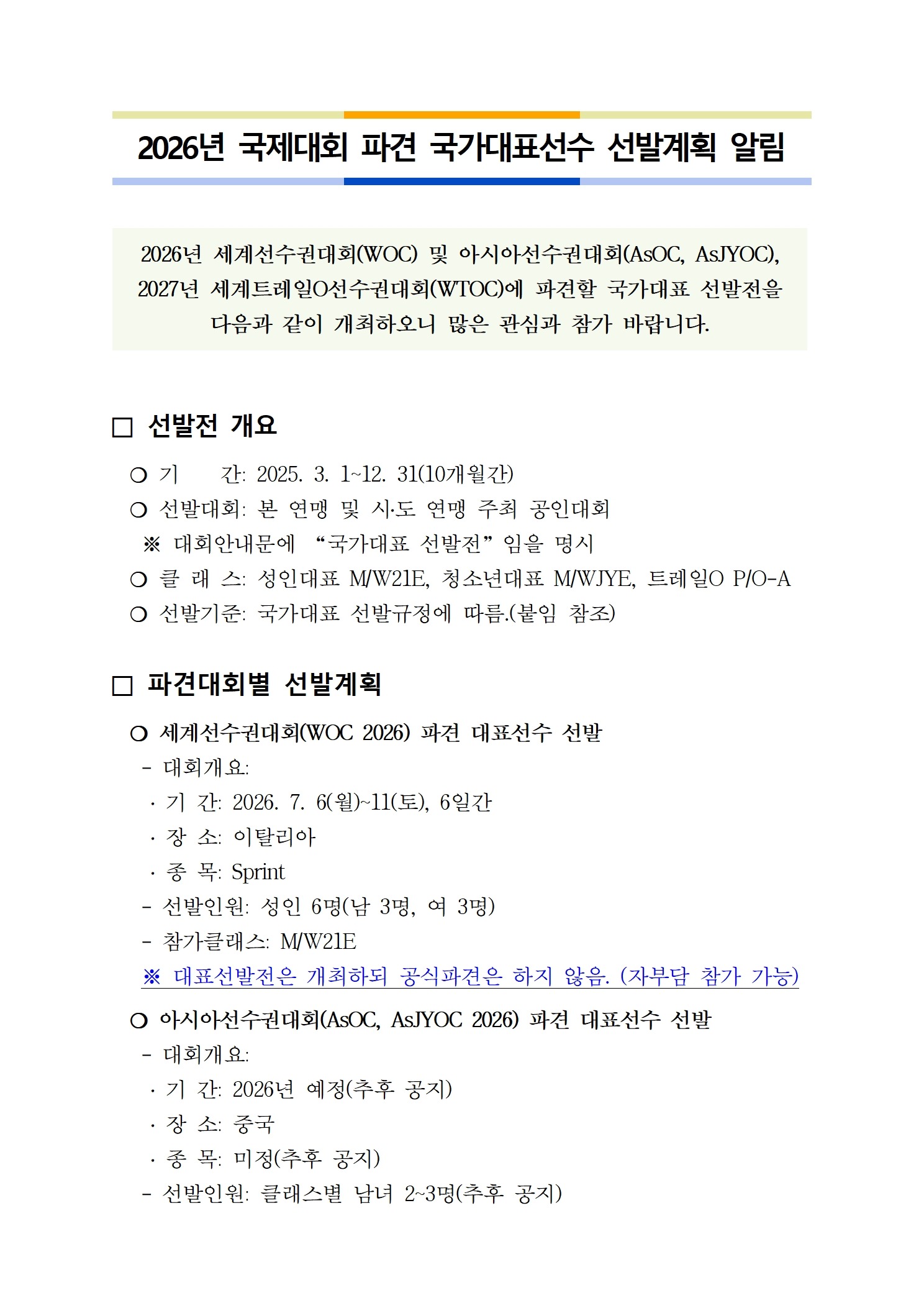 2026년 국제대회에 파견할 국가대표선수 선발계획을 다음과 같이 공지하오니 관심있는 선수들의 많은 참가 바랍니다.