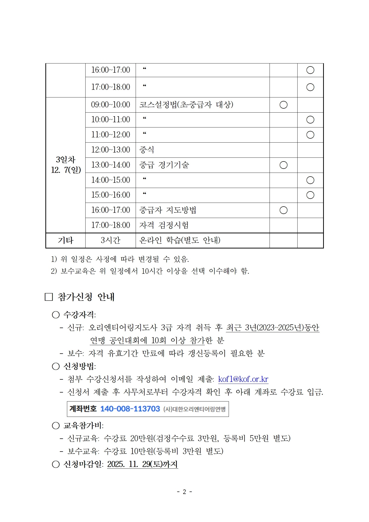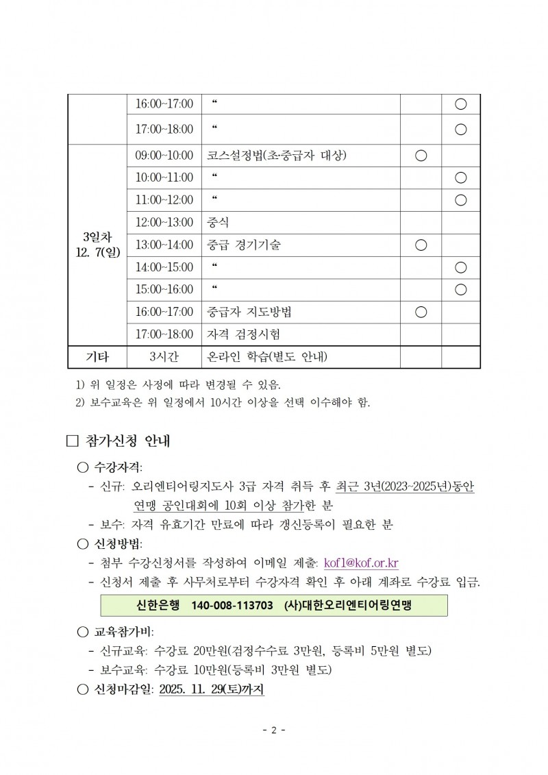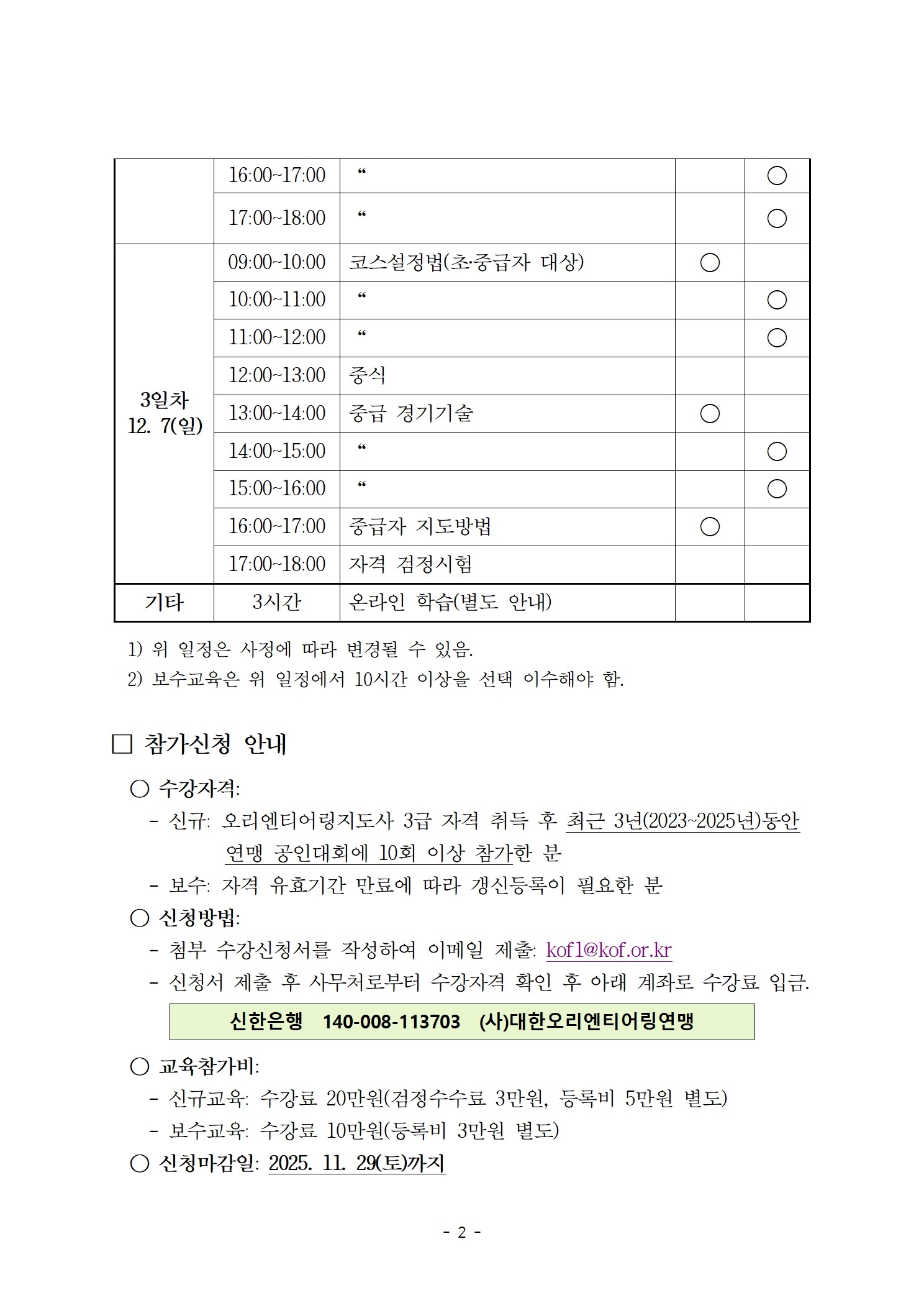 대회운영 등을 담당할 「오리엔티어링지도사 2급 신규‧보수 교육과정」을 다음과 같이 개최하오니