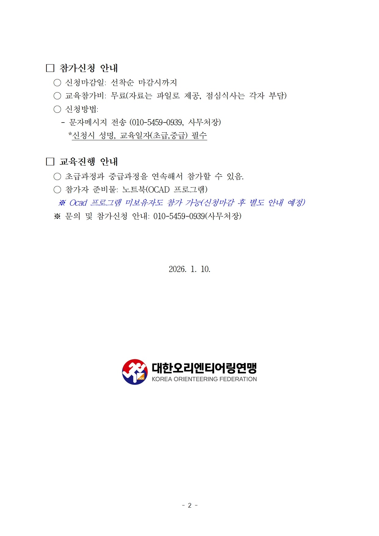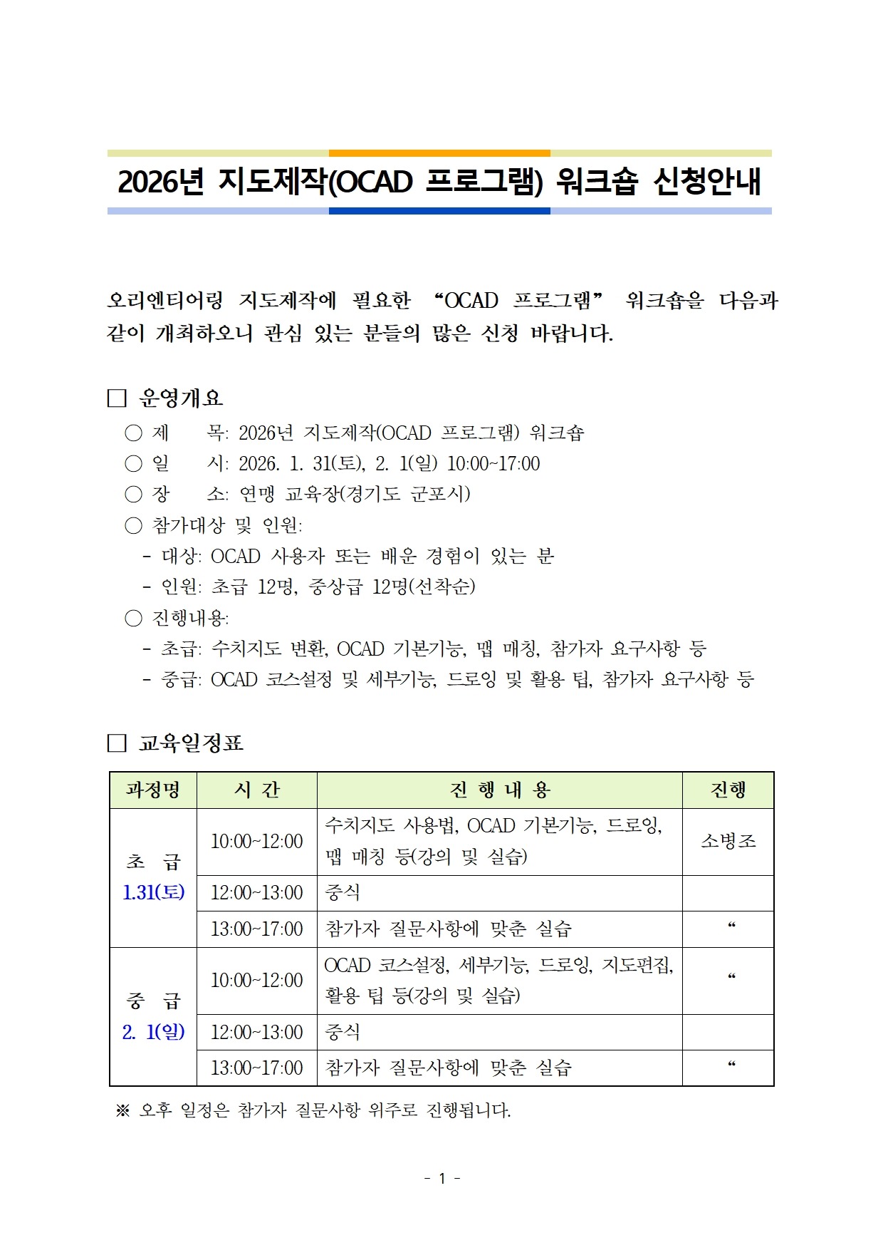 오리엔티어링 지도제작에 필요한 “OCAD 프로그램” 워크숍을 다음과 같이 개최하오니