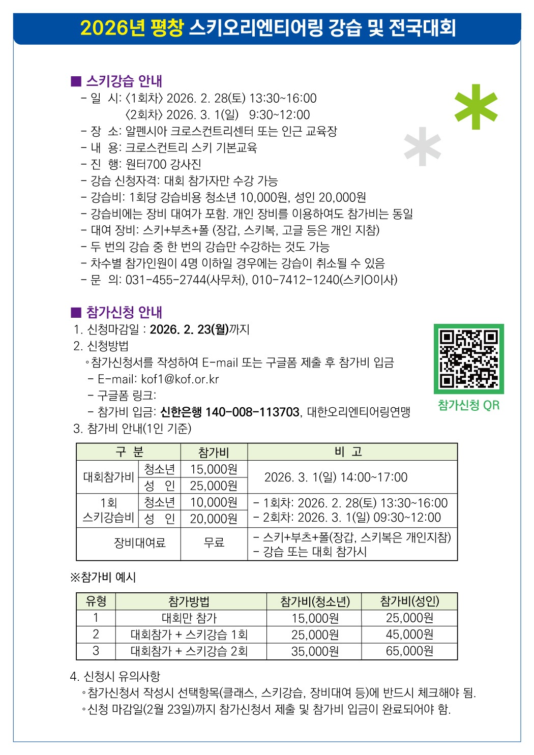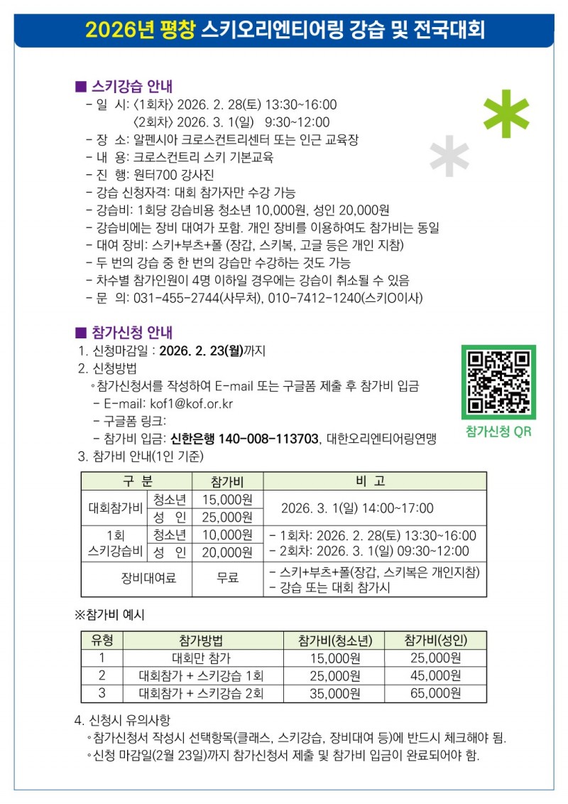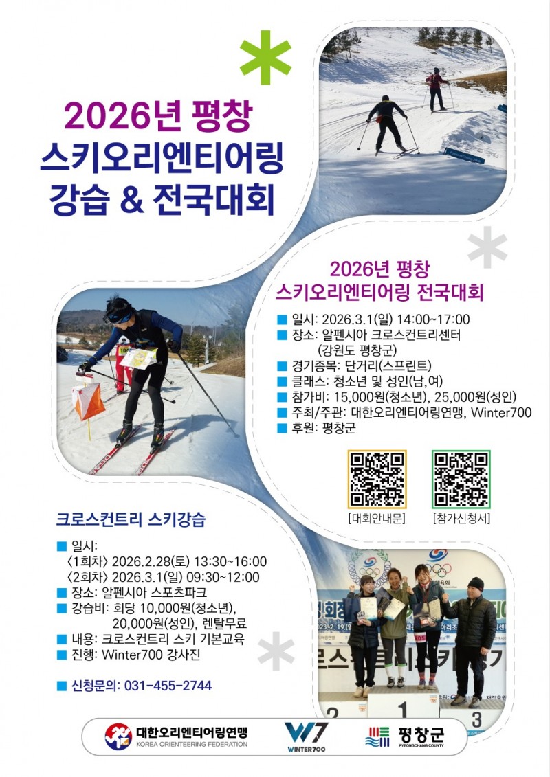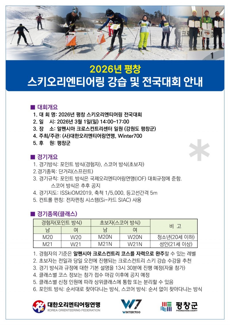 2026년 평창 스키오리엔티어링 강습 및 전국대회를 2월 28일(토)부터 3월 1일(일)까지