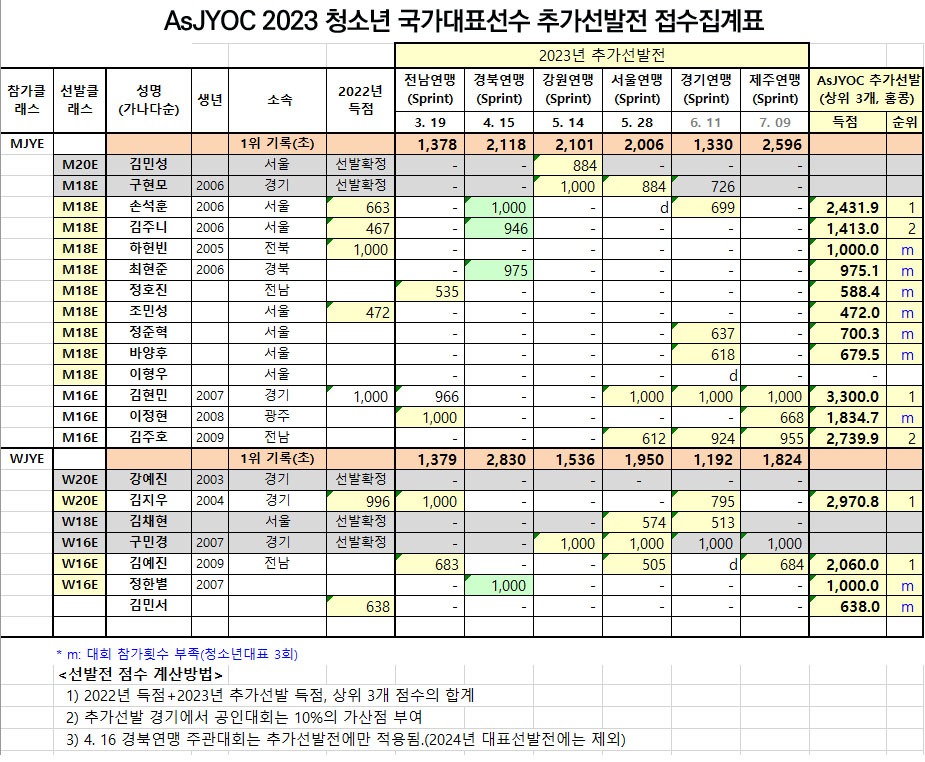 AsJYOC 2023 참가를 위한 청소년 국가대표 선수 추가선발전 결과를 다음과 같이 공지합니다.