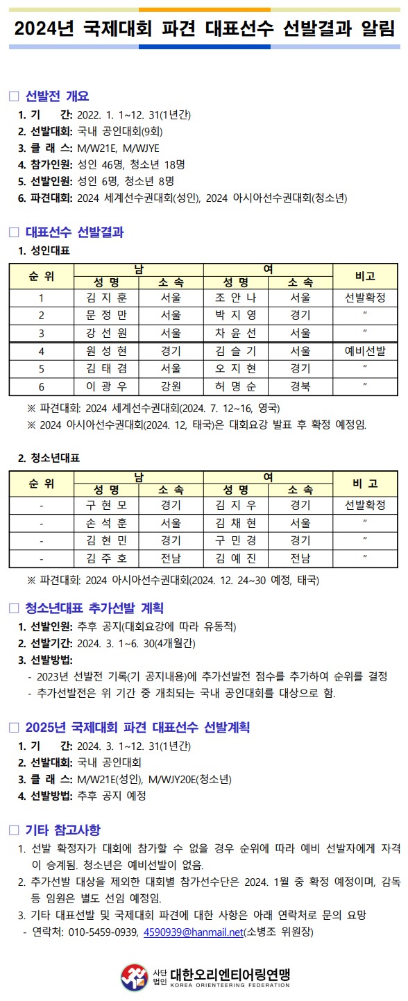 2024년 국제대회 파견 대표선수 선발결과를 다음가 같이 공지합니다.