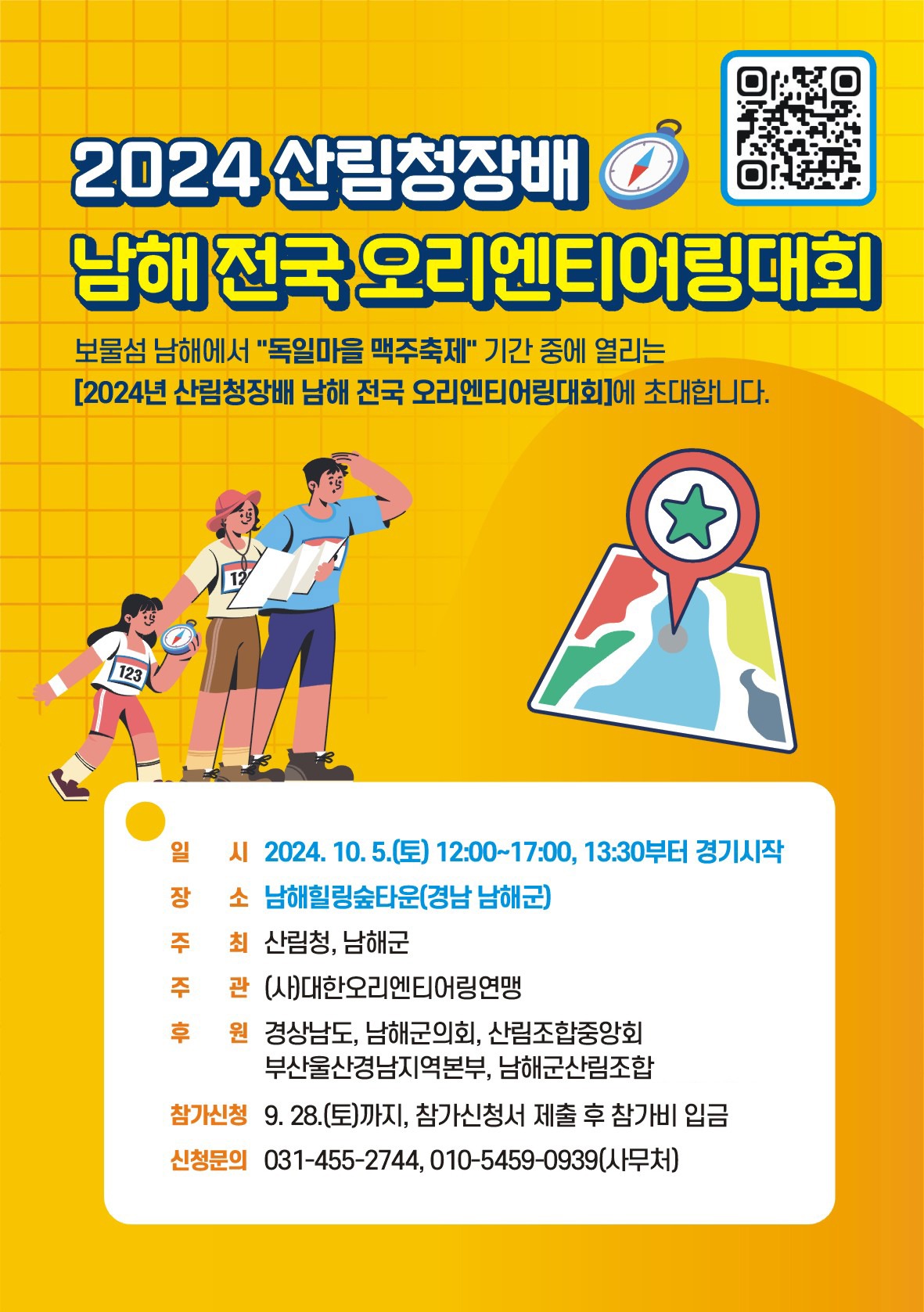 오리엔티어링을 통한 산림레포츠의 저변확대와 건전 여가활동을 제공하고자 [2024년 산림청장배 남해 전국 오리엔티어링대회]를 개최하게 되었습니다. 보물섬 남해에서 "독일마을 맥주축제" 기간중에 열리는 이번 대회에 많은 관심과 참가 바랍니다.