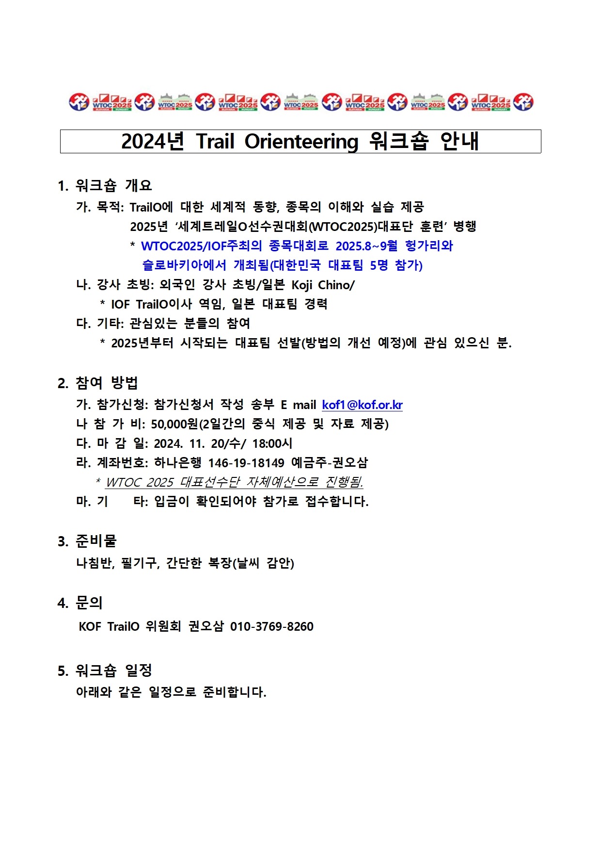 [2024년 Trail Orienteering 워크숍]을 개최하고자 하오니 관심 있는 분들의 많은 신청 바랍니다.
