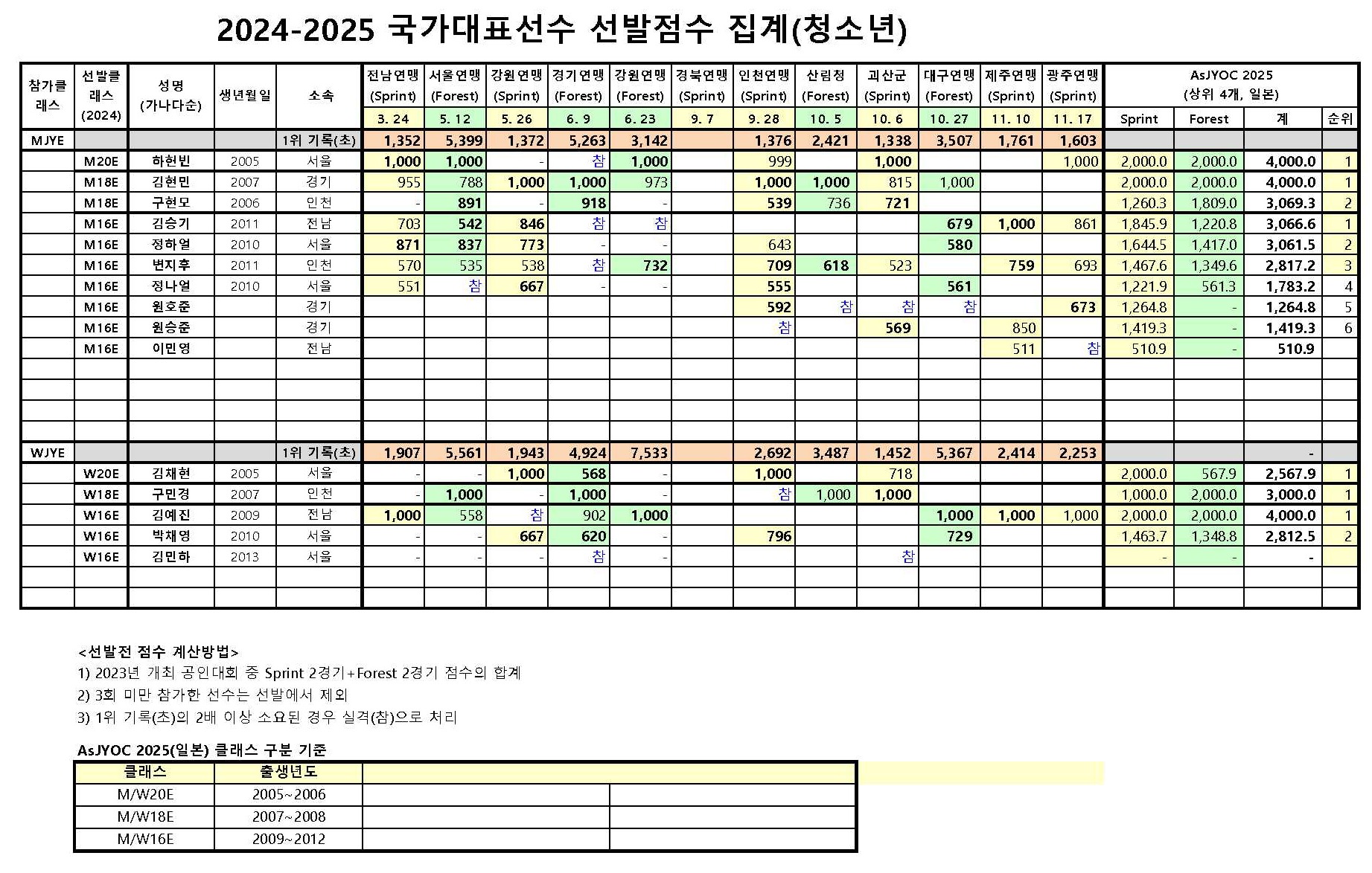 2024년 시행된 국가대표 선발전 점수집계 현황을 다음과 같이 공지합니다.